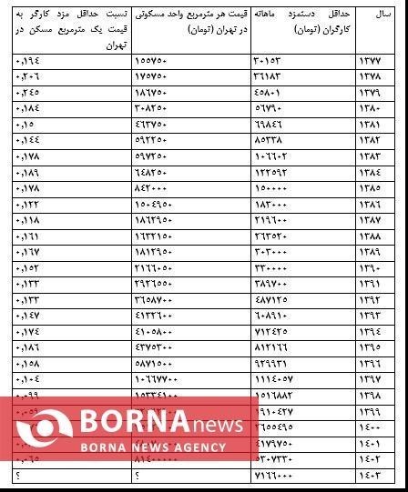 طبق آمار بانک مرکزی، یکی از بدترین سالها درباره نسبت حداقل مزد به قیمت هر مترمربع مسکن در شهر تهران مربوط به سال 1371 است که طبق آن، پسانداز هر ماه حداقل دستمزد کارگران برابر با قیمت 0.1 مترمربع مسکن در تهران بوده و به عبارتی 9 ماه پسانداز حداقل دستمزد آن سال، کفاف خرید تنها یک مترمربع مسکن در پایتخت را میداد.