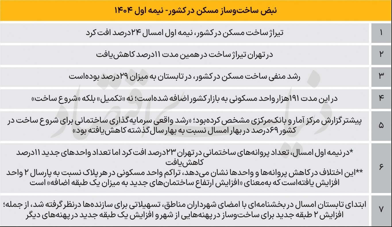 گزارش از دادههای جدید مرکز آمار درباره ساختوساز نشان میدهد، نیمه اول امسال علاوهبر اینکه در تهران، تیراژ ساخت مسکن 11درصد افت کرد، در کشور شرایط از این، نامناسبتر بود بهطوریکه تیراژ ساخت با کاهش 24درصدی نسبت به نیمهاول پارسال همراه شد. در کشور طی 6 ماه اول 1404 تعداد 191هزار واحد مسکونی جدید احداث شد که البته منظور از احداث، «صدور پروانه» و شروع عملیات ساخت است، نه «تکمیل و عرضه به بازار مصرف.» هم در تهران و هم در کشور، وضعیت تولید مسکن در تابستان، بسیار کاهشی بود.