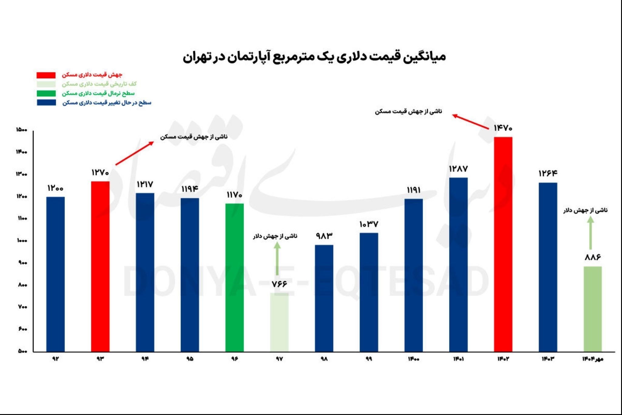 قیمت دلاری هر مترمربع آپارتمان در تهران در سال 1403 به رقم 1264 دلار کاهش یافت. اما در حال حاضر یعنی مهر 1404، به علت آنکه بازار معاملات مسکن تهران از اواخر خرداد در پی جنگ تحمیلی 12 روزه، در رکود سنگین خرید قرار گرفته است، و در مقابل، قیمت دلار به بالای 100 هزار تومان و ثبت قلههای جدید پیش رفت، «قیمت دلاری مسکن» افت سنگین را تجربه کرد. قیمت دلاری مسکن در تهران در حال حاضر، 886 دلار در مترمربع است که 34 درصد نسبت به مهر سال گذشته کاهش از خود نشان میدهد. سال گذشته همین موقع، قیمت دلاری آپارتمان 1335 دلار بود؛ بالاتر از سطح نرمال. دماسنج دلاری بازار مسکن در حال حاضر، سطحی پایینتر از سطح نرمال 1170 را نشان میدهد اما در عین حال نماگر آن، هنوز به کف تاریخی نرسیده است.