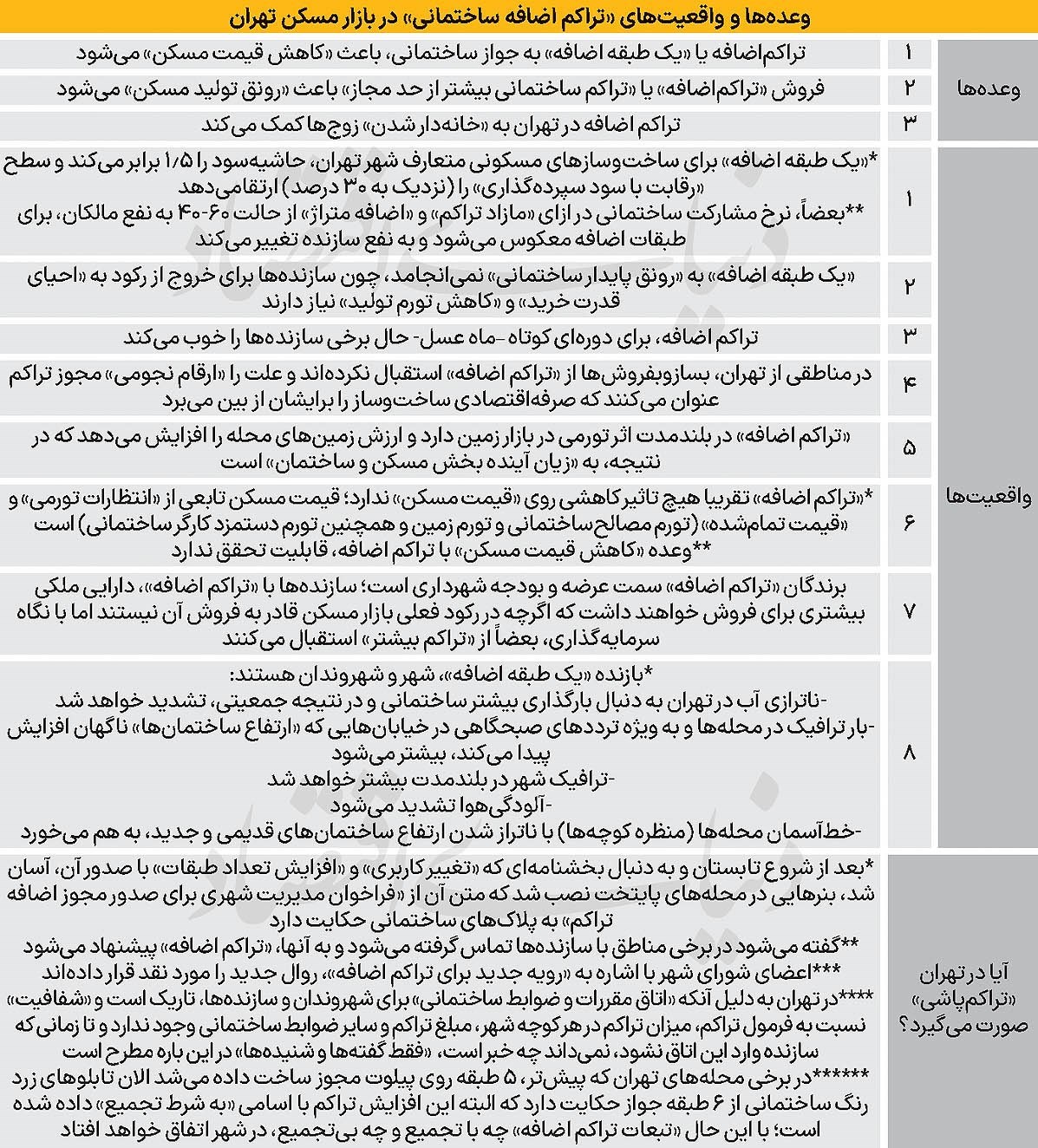 وی ادامه داد: خیابانی در همین منطقه وجود دارد که تا پیش از این، در آن واحد 6 طبقه ساخته نشده بود، اما امروز به راحتی مجوز ساخت 6 طبقه و حتی 7 طبقه به شرط تجمیع داده میشود. سازنده دیگری در منطقه شهران تهران تاکید کرد: اگر در گذشته با تجمیع 3 پلاک مساحت زمینی به 750 متر میرسید، امکان دریافت مجوز ساخت 7 طبقه در این منطقه داده میشد، اما در شرایط کنونی مدیریت شهری سختگیری در خصوص تامین 750 متر زمین برای اعطای این تراکم ندارد و راحت این تراکم اعطا میشود. مدیریت شهری «اعطای تراکم مازاد» در پایتخت را به اشکال مختلفی پیگیری میکند، این موضوع با مخالفت کارشناسان متعددی روبهرو شده و سیلی از انتقادات را به مدیریت شهری وارد کرده است؛ اگرچه مدیران شهری این موضوع را رد میکنند، اما دادههای متعددی این موضوع را تایید میکند. نمونهای از این دادهها، نصب بنری در یکی از مناطق بود که در روزهای گذشته خبرساز شده بود. اگرچه مدیریت شهری چنین موضوعی را رد کردهاند، اما تاکید دارند که مدیریت شهری به دنبال رونق ساختوساز در تهران در چارچوب قوانین حاکم بر حوزه شهرسازی با هدف کاهش قیمت مسکن است.