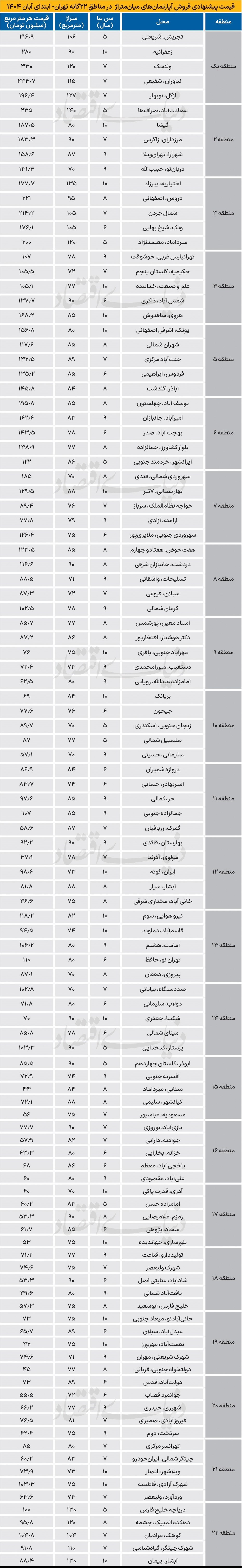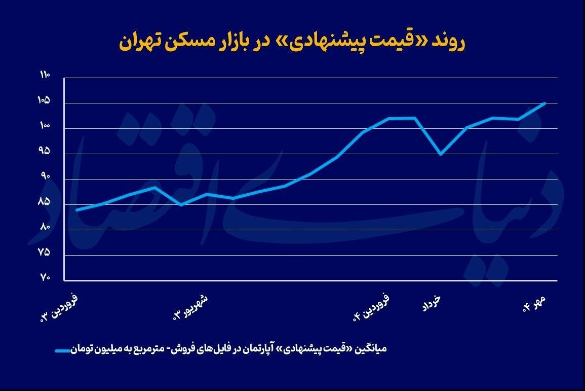 پس از ماه‌ها ثبات قیمتی در بازار مسکن در اولین ماه پاییز، بازار مسکن تهران با رشد 2.9 درصدی میانگین «قیمت پیشنهادی» همراه شد. مشاهدات صورت گرفته از واحدهای مسکونی در نوبت فروش نشان می‌دهد، میانگین «قیمت پیشنهادی» آپارتمان‌ها در محله‌های منتخب مناطق 22گانه تهران در ابتدای آبان به 105‌میلیون تومان در مترمربع رسید که این نسبت به ابتدای مهر که قیمت پیشنهادی آپارتمان‌های میان‌متراژ 102‌میلیون تومان بوده، حاکی از نوعی خزش قیمت پس‌از ماه‌ها ثبات نسبی است. روایت واسطه‌های ملکی نشان می‌دهد با وجود اینکه برخی از فعالان این بخش معامله‌ای در شهریور انجام نداده‌اند، اما در مهرماه بین 3 تا 5 قرارداد منعقد کردند.