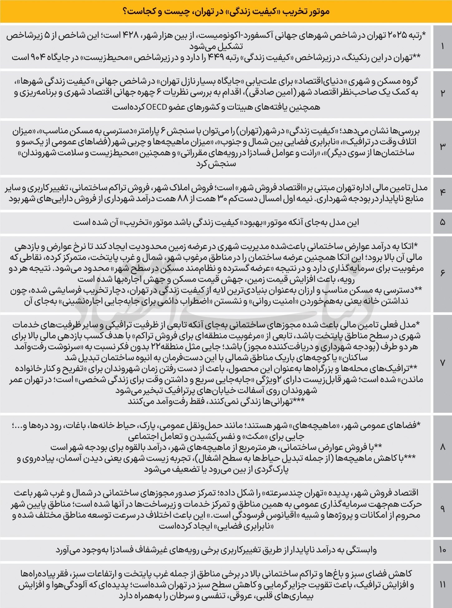 براساس این شاخص جهانی در سال2025، نیویورک برترین شهر جهان شد، اما رتبه تهران از بین هزار شهر، 428 شد که در این رنکینگ، در شاخص کیفیت زندگی رتبه 449 و در شاخص محیطزیست در رتبه 904 قرارگرفت و این ارقام حاکی از شکل نامناسب عملکرد مدیران شهری بوده که موتور کیفیت زندگی تهرانیها را تخریب کردهاست، اما سوال اصلی اینجاست که چرا مصادیق این شاخصها در تهران ضعیف بودهاست و تخریبچی کیفیت زندگی در تهران چیست؟ «دنیایاقتصاد» در مطالعاتی، با اتکا بهنظریات معتبرترین چهرههای اقتصاد شهری و برنامهریزی جهانی، همچون گلیزر، آنجل، برتو، گهل، استورپر، گلستر و همچنین یافتههای دفتر اسکان بشر سازمان ملل(هبیتات) و سازمان توسعه و همکاری اقتصادی(OECD) به بررسی «مدل مالی ناپایدار تهران» و «کیفیت زندگی شهروندان» پرداخته که چگونه مدل تامین مالی تهران یعنی «اقتصاد فروش شهر»، زندگی مردم را میسوزاند.