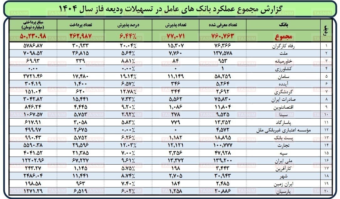 در بین بانک‌های عامل، بانک کشاورزی هیچ عملکردی در این زمینه نداشته است. طی بازه اشاره شده تنها یک تقاضا به بانک مذکور معرفی شده که تا تاریخ اول اذرماه 1404 اقدامی برای آن صورت نگرفته است.