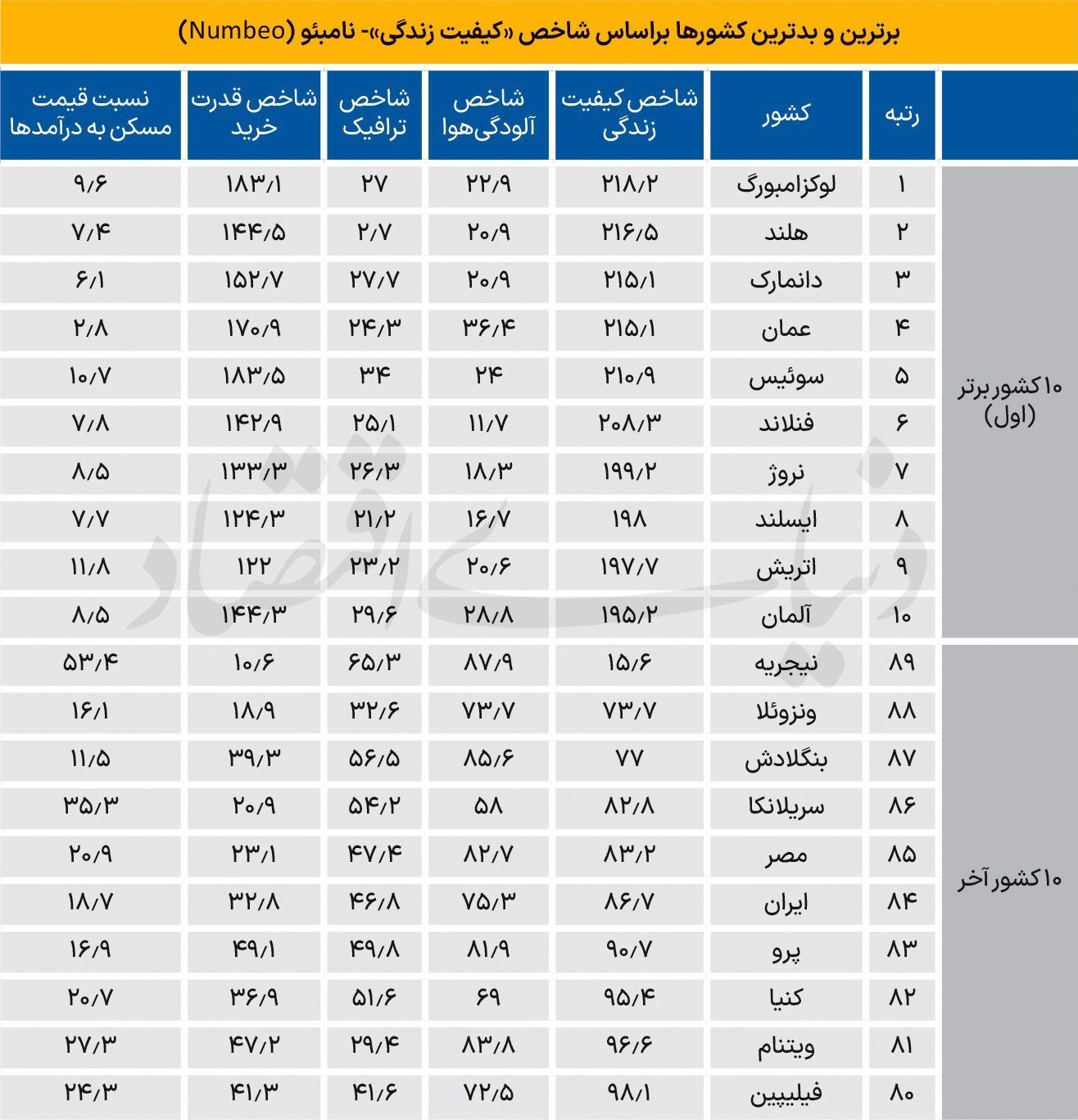 در این شاخص، ایران با رتبه 84، رتبهای نزدیک به انتهای جدول دارد و ششمین کشور از پایینترین سطح کیفیت زندگی را به خود اختصاص دادهاست. کشورهایی مانند لوکزامبورگ، هلند، دانمارک، عمان، سوئیس، فنلاند و نروژ به دلیل عملکرد قوی در 9 زیرشاخص اصلی توانستهاند امتیاز بالایی کسب کنند. این کشورها معمولا ترکیبی از ثبات اقتصادی، زیرساختهای شهری کارآمد، قدرت خرید بالا، امنیت اجتماعی، سلامت عمومی و محیطزیست پاک را ارائه میدهند، بهویژه توان مالی بالای خانوارها، حملونقل عمومی پیشرفته، شفافیت نهادی و کیفیت خدمات شهری نقش محوری در جایگاه بالای آنها داشتهاست.