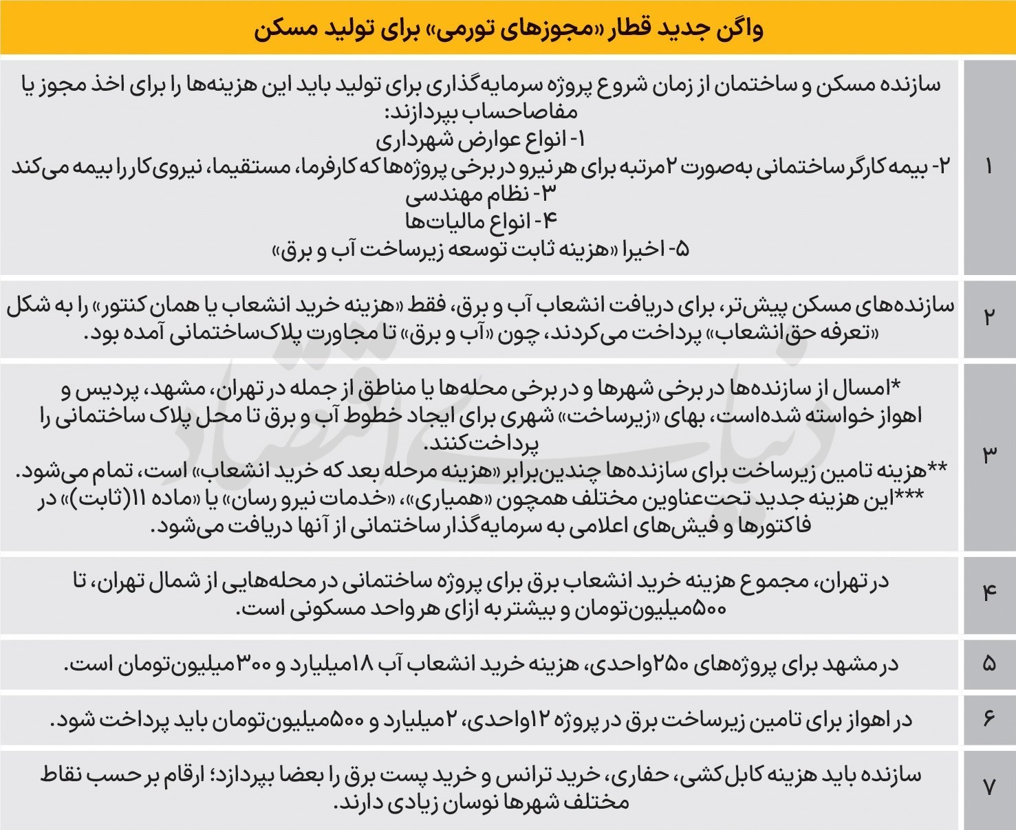 بر اساس این گزارش شوک تعرفهای برای خرید انشعاب برق و آب در سمت عرضه مسکن طی سالجاری، بعداز آن بهوجود آمد که منابع آبی از اواسط بهار دچار «ناترازی شدید» شد و تبعات آن به شکل «قطعیهای چند ساعته» خدمات مشترکان در شهرها بروز کرد. در حالحاضر ظاهرا بخشی از این ناترازی آبی و برقی را قرار است سرمایهگذاران بخش مولد اقتصاد برطرف کنند اما وضعیت قیمتها در سمت مصرف همچنان ناتراز است. این تحمیل هزینه تازه در مرحله صدور مجوز سرمایهگذاری ساختمانی شبیه هزینهای است که برای مجوز ساخت در قالب عوارض شهرداری از سازندهها دریافت میشود. عوارض سنگین تولید مسکن و فاصله نجومی آن با عوارضی که در مرحله بهرهبرداری بابت عوارض نوسازی شهری دریافت میشود، در عمل روی «بهای دسترسی به مسکن» اثر تورمی داشته و در مقابل، «بهای بلااستفاده گذاشتن مسکنهای ساختهشده» را تا حد «صفر» تنزل دادهاست. سازندهها در حالحاضر فهرستی از انواع هزینهها در مرحله مجوز سرمایهگذاری را باید بپردازند. این فهرست شامل «بیمه کارگر ساختمانی بهصورت 2مرتبه برای نیرویکار»، «نظام مهندسی»، «انواع عوارض شهرداری»، «مالیات» و «تامین زیرساخت شهری» است.