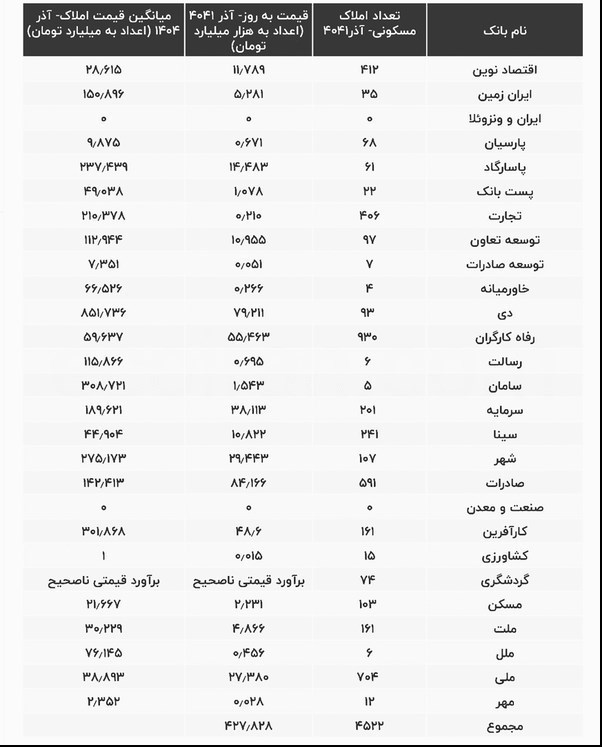 در مقابل، بانک گردشگری به دلیل برآوردهای غیرمنطقی (مانند ملکی با قیمت 500 تومان یا 35 هزار تومان) از محاسبه حذف شده است.