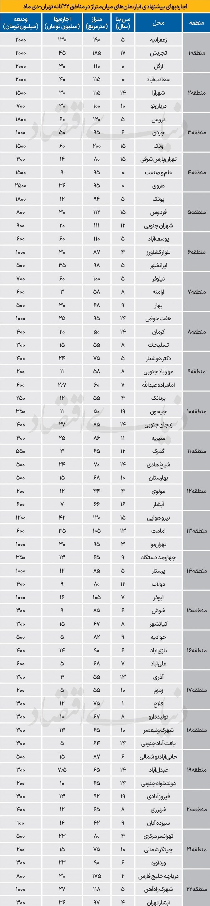 در واقع میتوان گفت؛ با تبدیل کامل پول پیش، میانگین اجاره ماهانه آپارتمان 70 مترمربعی در تهران حدود 31 میلیون تومان است. همچنین تحقیقات میدانی از فایلهای آنلاین بازار اجاره مسکن نشان میدهد، میانگین اجارهبهای پیشنهادی واحدهای عرضهشده در دیماه، در سطح حدود 20میلیونتومان اجاره ماهانه بهعلاوه رقمی در حدود 900میلیونتومان پول پیش تثبیت شدهاست. بررسی روندهای قیمتی حاکی از آن است که بازار اجاره در این ماه با تورم ماهانه نزدیک به صفر همراه بوده و حتی سرعت رشد تورم نقطهبهنقطه اجاره نیز کاهش محسوسی را تجربه کردهاست؛ بهگونهای که رشد نقطهای اجاره نسبت به سالگذشته به سطحی بسیار کمتر از 20درصد رسیدهاست.