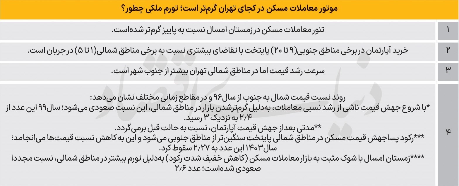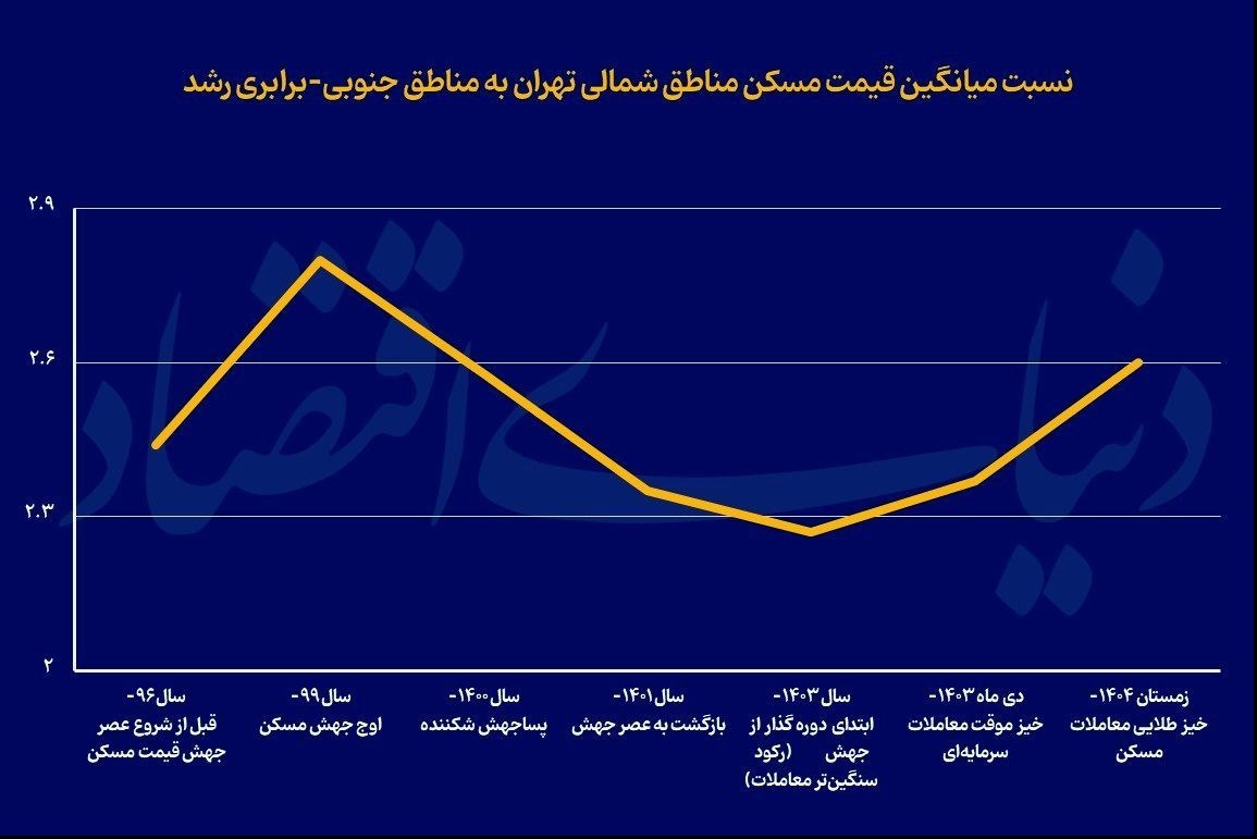 مقطع پنجم به سال1400 مربوط است که پس از حدود سه سال، اثر تورم در مناطق جنوبی نیز منعکس شد و نسبت قیمت شمال به جنوب به حدود 2.6 کاهشیافت. در مقطع ششم، بازار با رکود عمیقتری مواجه شد. در سال1403، تحتتاثیر کاهش قدرت خرید خانوارها، افزایش نااطمینانیهای اقتصادی و سایه ریسکهای سیاسی، رکود معاملات در مناطق شمالی شدیدتر شد و همینموضوع باعث کاهش فاصله قیمتی شد؛ بهطوریکه این نسبت به 2.27 سقوط کرد که حتی از سطح سال1396 پایینتر بود. اما در مقطع هفتم و همزمان با زمستان امسال، نشانههایی از کاهش شدت رکود و بازگشت نسبی معاملات مشاهده شد. دادههای «شاخص مسکن دنیایاقتصاد» در بهمن 1404 نشان میدهد با گرمترشدن نسبی بازار، تورم بار دیگر ابتدا در مناطق شمالی ظاهر شده و نسبت میانگین قیمت آپارتمانهای مناطق یک تا 5 به مناطق جنوبی به حدود 2.6 رسیدهاست. این موضوع تایید میکند که تورم مسکن در تهران هنگام «بازگشت خریداران به بازار» شیب بیشتری پیدا میکند و فاصله مناطق دوباره افزایش مییابد. این الگو نشان میدهد؛ وقتی بازار از رکود فاصله میگیرد و معاملات افزایش مییابد، رشد قیمت ابتدا در مناطق سرمایهای و شمالی شکل میگیرد، اما با گذشت زمان و انتقال تورم به مناطق جنوبی، فاصله قیمتی کاهش پیدا میکند، بههمیندلیل، چرخه رونق و رکود در بازار مسکن بهصورت مستقیم بر شکاف قیمتی مناطق اثر میگذارد.
