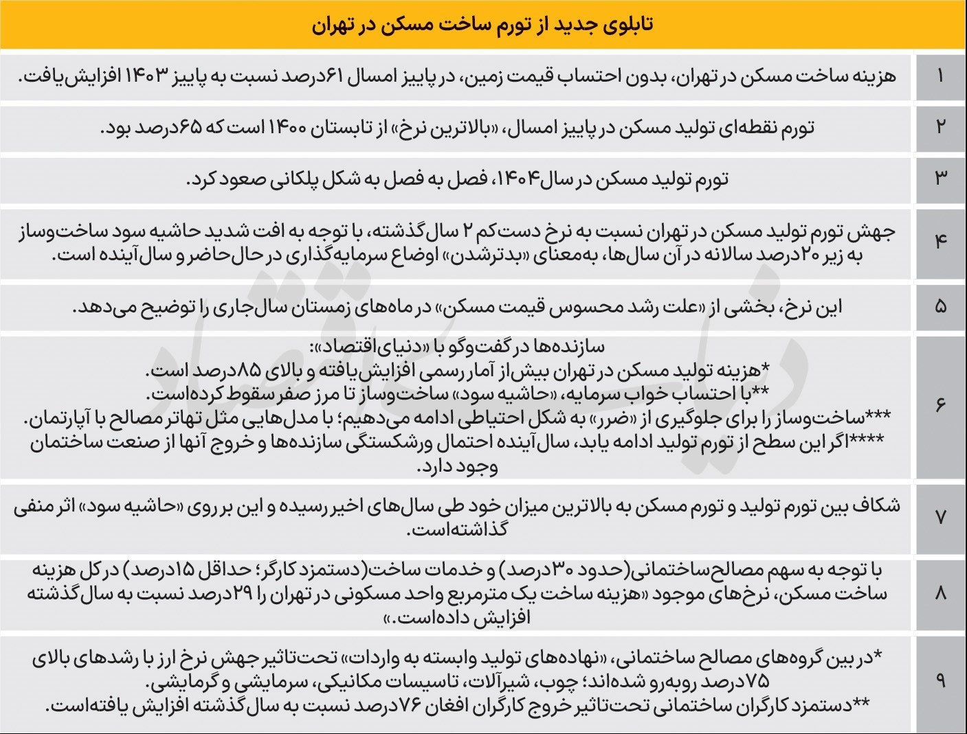 مرکز آمار ایران شاخص قیمت نهادههای ساختمانی در شهر تهران در فصل پاییز را برابر 204.8 اعلام کرد؛ این رقم نسبت به میزان این شاخص در پاییز1403 رشدی 61.3درصدی داشت. این رقم بیشترین میزان تورم نقطهای نهادههای ساختمانی پس از تابستان سال1400 بود که میزان رشد این شاخص نسبت به دوره مشابه در سال1399 به 65درصد رسید. همچنین براساس گزارش مرکز آمار ایران میزان شاخص قیمت نهادههای ساختمانی در پاییز نسبت به تابستان 18.4درصد زیاد شده و این در حالی است که تورم فصلی نهادهها در تابستان نسبت به بهار 6.3درصد بودهاست.