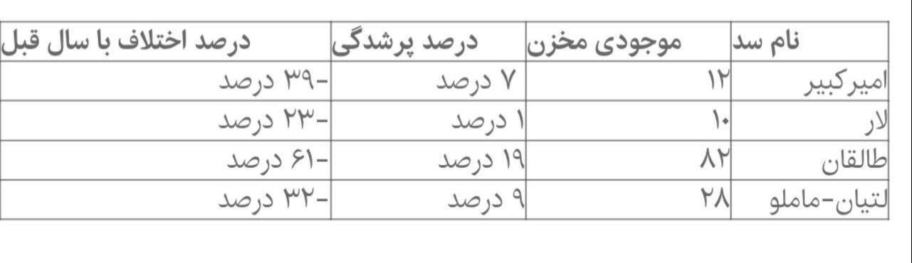 سدهای لتیان- ماملو نیز مجموعاً 28 میلیون مترمکعب موجودی مخزن دارد که نشاندهنده پرشدگی 9 درصدی است. با این حال، حجم مخزن این سد نسبت به مدت مشابه سال گذشته 32 درصد کاهش یافته است.