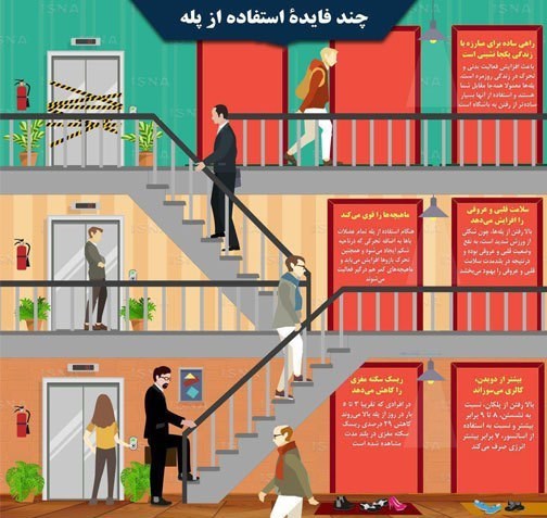 عصر ساختمان- سوزاندن کالری؛ کاهش ریسک سکته قلبی؛ افزایش سلامت قلب و عروق؛ تقویت ماهیچه ها از فواید استفاده از پله است.