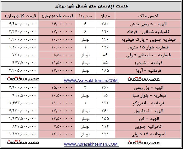 عصر ساختمان:قیمت آپارتمان در شمال شهر تهران به شرح زیر است.