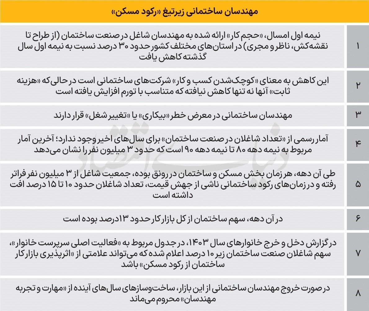 مهندسان ساختمانی براساس گفتوگویی که «دنیایاقتصاد» با برخی از آنها انجام داده، آثار «افت پروژههای ساختمانی» و «کوچکشدن بازار خدمات مهندسی» را در ماههای اخیر احساس کردهاند و برخی از آنها در تهران از «افت 50 درصدی سفارشها» نسبت به سال گذشته میگویند. شرکتهای خدمات مهندسی ساختمان، در مقابل این کاهش بازار خرید خدمت از سمت سازندهها، مجبور به تحمل «هزینههای ثابت» از جمله حقوق و دستمزد مهندسان فعال در شرکتها هستند. در این صورت، ادامه «رکود خرید خدمات مهندسی ساختمان» میتواند باعث «تعدیل نیرو» در بازار اشتغال مهندسان ساختمان شود. برخی مهندسان ساختمانی در آستانه «تغییر شغل» قرار دارند. هر دو اتفاق، یعنی بیکاری مهندسان یا تغییر شغل مهندسان ساختمان، پیامدهایی به همراه دارد.