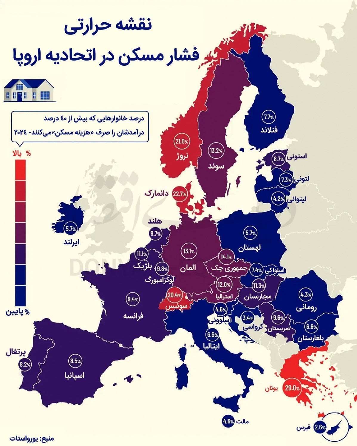 در گزارش تحلیلی دیگری برای سال 2024، کشورهایی مثل یونان، بلغارستان و رومانی نرخهای بالایی در شاخص عدم دسترسی به مسکن مناسب دارند، جمعیتی که در خطر از دست دادن دسترسی مناسب به مسکن هستند. این وضعیت بیانگر این است که مسکن نه تنها فشار هزینهای ایجاد کرده، بلکه برخی خانوارها ممکن است مجبور به ترک خانه یا کاهش کیفیت زندگی شوند.