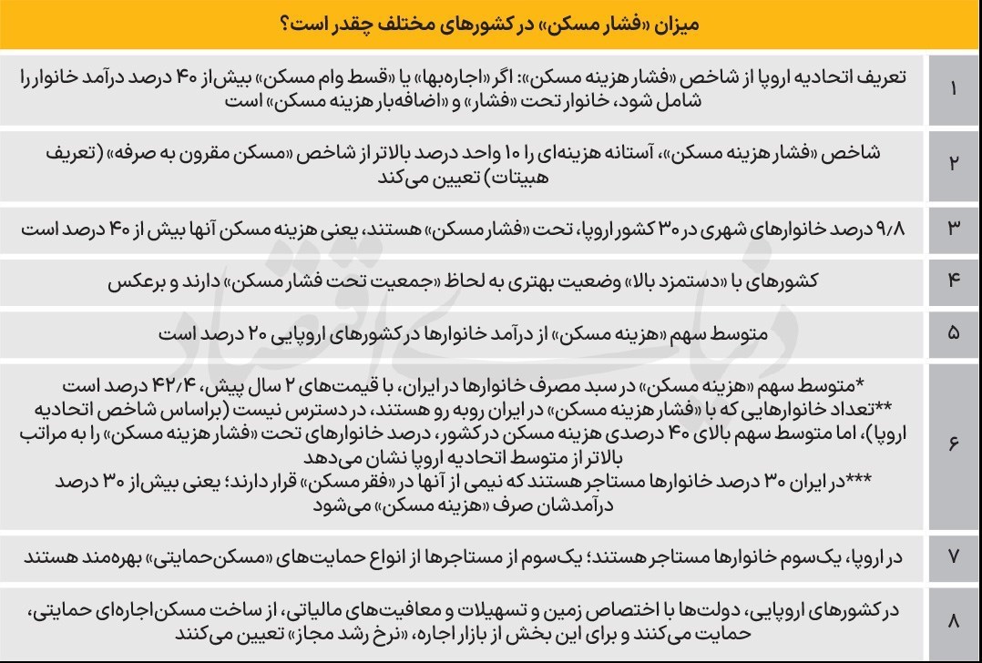 بررسیهای «دنیایاقتصاد» از دادههای مربوط به بازار اجاره اروپا در «یورواستات» و «کمیسیون اتحادیه اروپا» و همچنین «بانک مرکزی اروپا» حاکی از آن است حدود یکسوم از مستاجرهای کشورهای اروپایی از یکی از اشکال سبد حمایتی جهت داشتن مسکن در اطاعت بهرهمند میشوند. با توجه به این بررسیهای اتحادیه اروپا، میتوان آن را با ایران مقایسه کرد. درحالیکه حدود 10 درصد از جمعیت اتحادیه اروپایی بار اضافه هزینه مسکن (بالای 40 درصد از درآمد خانوار) را تحمل میکنند در ایران، سهم خانوارها به مراتب بسیار بیشتر از 10درصد است. براساس دادههای ارائه شده مرکز آمار در سال 1402، سهم هزینه مسکن در کل کشور 42 درصد از کل سبد مصرف خانوار را به خود اختصاص میداد. این در حالی است که میانگین هزینه مسکن براساس درآمد خانوار در کل اروپا 20درصد است و این نشان میدهد که بار اضافه هزینه مسکن، بر بسیاری از خانوارهای ایرانی تحمیل و فشار مضاعفی بر آنها وارد کرده و بخش قابل توجهی را از مسکن مقرون به صرفه محروم کرده است.
