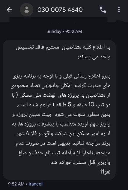 شرکت عمران میگوید حدود 600 نفر از متقاضیان نهضت ملی مسکن بعد از واریز وجه اولیه 40 میلیون تومان و بیشتر، اقدامی برای پرداخت مابقی سهم آورده خود انجام ندادهاند که این پیامک برایشان ارسال شده است.