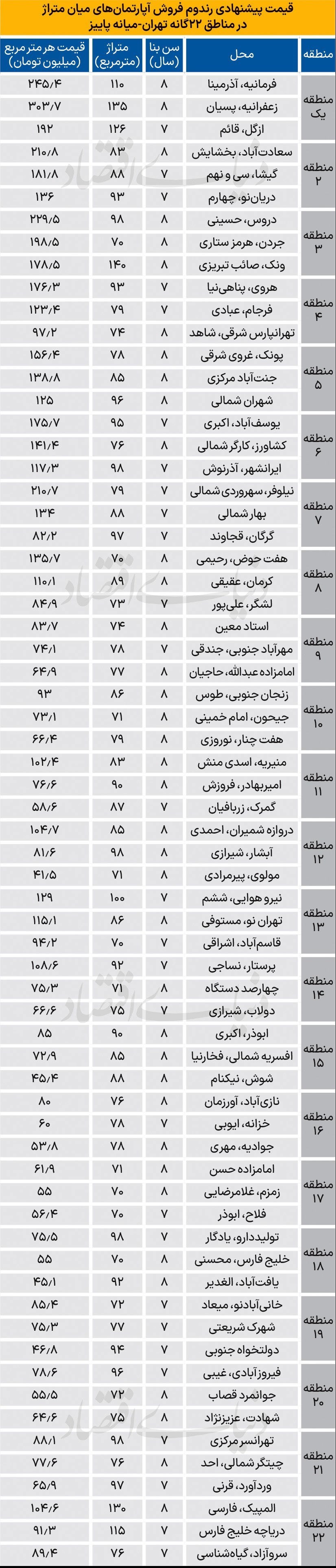 به گزارش پایگاه خبری «عصر ساختمان» به نقل از دنیای اقتصاد، دادههای موجود از فایلهای مورد بررسی نشان میدهد، میانگین «قیمت پیشنهادی» در تهران در حدود 107میلیونتومان در هر مترمربع با متوسط سن بنای 7.5 سال و میانگین متراژ 87 مترمربع است. فایلهای رندوم مورد بررسی نشان میدهد، در برخی از مناطق جنوبی تهران، محلههایی با پایینترین سطح قیمتی وجود دارند که میتوان آپارتمانهایی میان متراژ، زیر 5میلیاردتومان خریداری کرد، اگرچه این سطح قیمتی با توجه بهقدرت خرید مردم، قیمت بالایی محسوب میشود، اما در مقایسه با دیگر فایلهای ارائهشده به بازار، در گروه ارزانترین آپارتمانهای تهران بهشمار میروند.