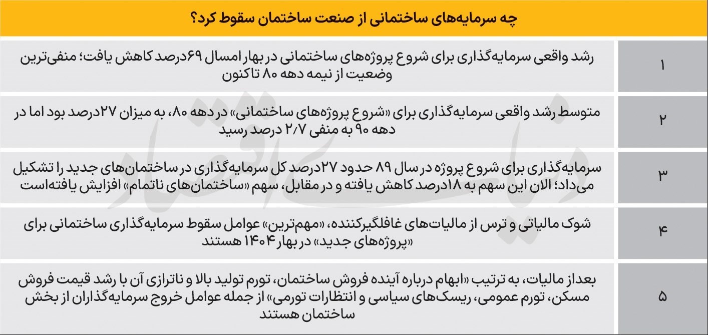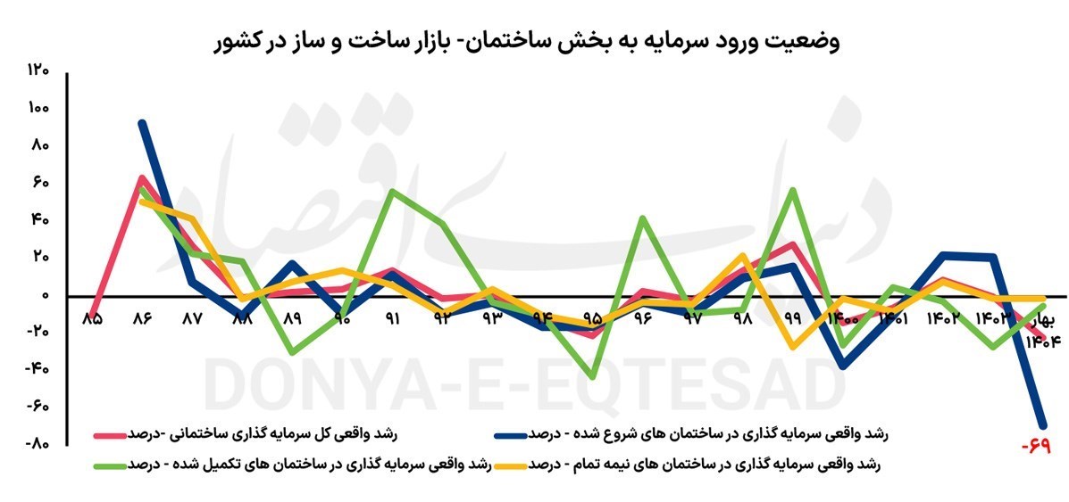 بررسی‌‌‌‌‌ها از واقعیت سرمایه‌گذاری ساختمانی در همین فصل اول سال‌1404 نشان می‌دهد، با توجه به تورم تولید حدود 45‌درصدی ناشی از فقط دو فاکتور «مصالح‌‌‌‌‌ساختمانی» و «دستمزد کارگر و نیروی‌‌‌‌‌کار خدمات ساخت»، حجم سرمایه‌گذاری در «پروژه‌های تازه» یا همان «شروع پروژه ساختمانی» به لحاظ رشد واقعی، پس‌‌‌‌‌از کسر تورم، 69‌درصد افت کرده‌است. این به‌معنای آن است که ابعاد واقعی سرمایه‌گذاری‌های ساختمانی نسبت به سال‌قبل، به شکل قابل‌توجهی کوچک شده‌است.  این میزان رشد واقعی منفی در «سرمایه‌گذاری‌ها برای ایجاد ساختمان تازه»، دست‌‌‌‌‌کم از سال‌86 تاکنون، «بی‌‌‌‌‌سابقه» است که البته با توجه به «ریسک‌های کم‌‌‌‌‌سابقه» موجود در مسیر سرمایه‌گذاری‌های مولد، چنین سقوطی از بازار ساختمان، معنادار می‌تواند باشد.