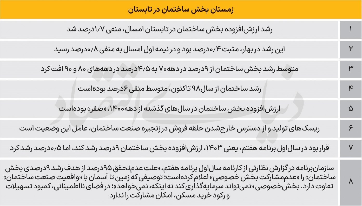 در کنار گزارش نظارتی از «ناظران اجرایی برنامه هفتم» که توسط دولت تهیه شدهاست و حدود 20 صفحه از این کتاب 370 صفحهای، به بخش مسکن و ساختمان اختصاص دارد، آمار جدید مرکز آمار ایران نیز از آخرین وضعیت رشد اقتصاد ایران نشان میدهد؛ بخش ساختمان در نیمه اول امسال نهتنها همان رشد مثبت بسیار محدود سالگذشته را تجربه نکرد که ارزشافزوده این بخش 0.8درصد کاهش پیدا کرد؛ رشد منفی. بخش زیادی از این رشد منفی ناشی از «اتفاقات تابستان امسال» بودهاست؛ رشد بخش ساختمان در تابستان منفی 1.7درصد شد.
