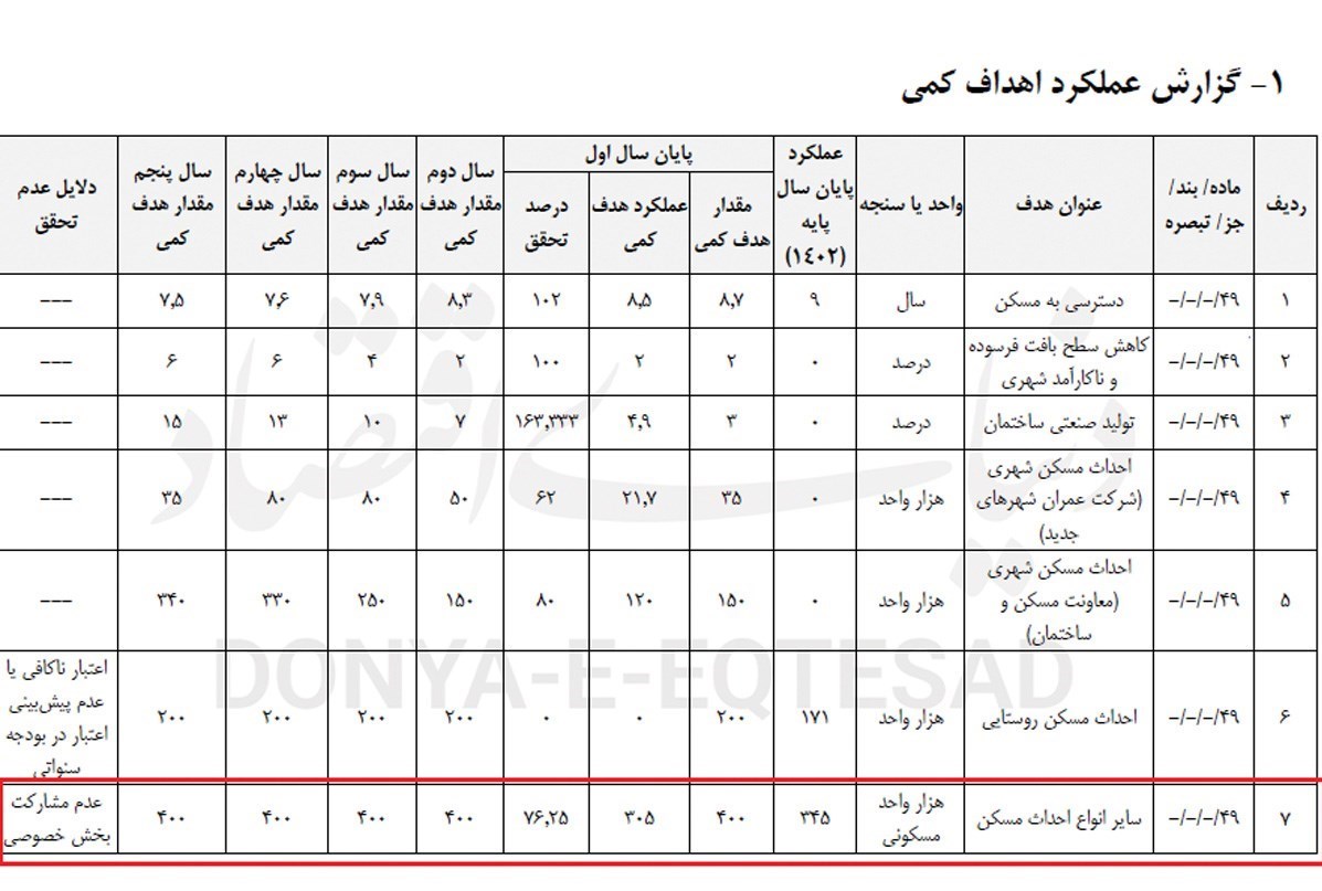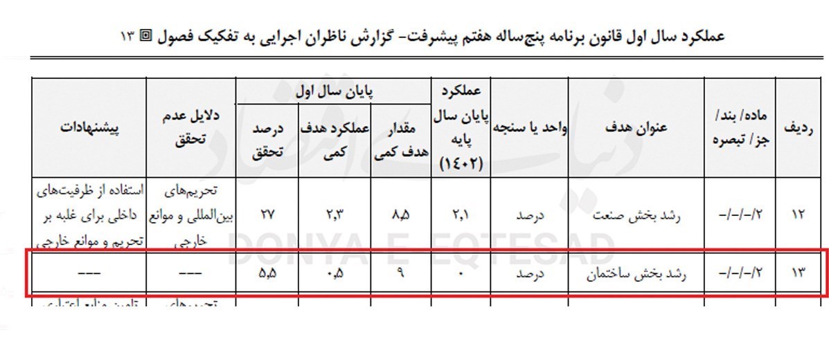 عددهای چاپ شده در کارنامه سالاول برنامه هفتم، برای بخش مسکن و ساختمان در 1403، سرگیجهآور است؛ از یکطرف میزان تحقق «نوسازی بافتفرسوده» 100درصد، تولید صنعتی ساختمان 160درصد و حتی میزان تحقق مسکنسازی دولتی 80درصد در گزارش نظارتی، درج شدهاست که اوضاع را مثبت و قابلرضایت توصیف میکند اما از طرف دیگر، درحالیکه قرار بود طبق این برنامه، بخش ساختمان در سالگذشته 9درصد رشد کند، فقط نیمدرصد رشد کرد و 94.5درصد «نرخ رشد هدف بخش» محقق نشد.