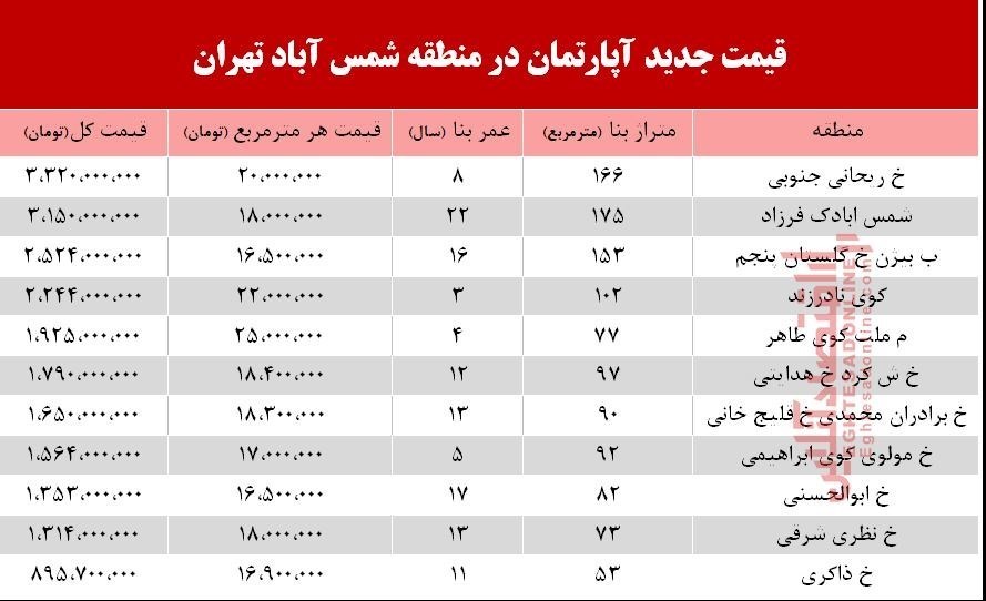 عصر ساختمان- آنچه در زیر میآید جدول قیمت معاملات انجام شده آپارتمان در منطقه شمس آباد تهران طی دی ماه۹۸ است.